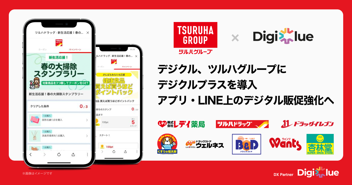 これにより、ツルハホールディングス傘下の8つの屋号(ウォンツ、ウェルネス、杏林堂薬局、くすりの福太郎、ツルハドラッグ、ツルハグループ ドラッグ&ファーマシー西日本、ドラッグイレブン、ビー・アンド・ディー、レデイ薬局)は、ツルハグループの各ネイティブアプリ・LINEミニアプリ上でのデジタル販促を展開し、デジクルは企画から運用まで一貫してサポートいたします。
